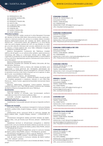 22 / JUDE%u021aUL ALBA WWW.GHIDULPRIMARIILOR.ROSC SPERAN%u021aA EL SRLSC AGROPEC DIONIS SRLSC JIDVEI SRLSC ROSANCO TRADE SRLSC AVIUTU SRLSC LA BOLTA SATULUI SRLSC EUROSPIN SRLSC HOBORI SRLSC MARIA TURISM SRL SC CONF ARIE%u0218UL SRLObiective turistice:Castelul Bethlen- Haller construit %u00een stilul Rena%u0219terii franceze din secolul al XVII-lea (1615-1640; Monumentul eroilor neamului - ridcat %u00een memoria eroilor din primul %u0219i al doilea r%u0103zboi mondial; Biserica Reformat%u0103-Calvin%u0103 din Cetatea de Balt%u0103, dat%u00e2nd din secolul XIII %u2013 monument istoric de categoria A, cu unul dintre cele mai vechi clopote, dat%u00e2nd din 1417; un cap t%u0103t%u0103resc ,%u00een relief, pe unul din zidurile interioare ale turnului, dat%u00e2nd din anul 1241; %u00een interior o fresc%u0103 dat%u00e2nd din anul 1525, %u00eenf%u0103%u021bi%u0219%u00e2nd imaginea apocaliptic%u0103 a judec%u0103%u021bii de apoiBiserica Evanghelic%u0103 %u2013Lutheran%u0103 din T%u0103t%u00e2rlaua, modest edificiu de stil gotic, cu un valoros altar poliptic, opera pictorului Vincentius din Sibiu %u0219i a lemnrului Simon (anul 1508), care cuprinde 12 compozi%u021bii la care se adaug%u0103 perdele cu scene biblice %u0219i ficuri de sfin%u021bi, reprezentativ pentru trecerea de la stilul Gotic la cel al Rena%u0219teriiBiserica Reformat%u0103 din S%u00e2nt%u0103m%u0103rieBisericile Ortodoxe din Cetatea de Balt%u0103, Cr%u0103ciunelu de Sus, S%u00e2nt%u0103m%u0103rie, T%u0103t%u00e2rlauaBiserica Rom%u00e2n%u0103 Unit%u0103 cu Roma, din Cetatea de Balt%u0103, care g%u0103zduie%u0219te o mic%u0103 p%u0103rticic%u0103 din r%u0103m%u0103%u0219i%u021bele p%u0103m%u00e2nte%u0219ti ale Sf%u00e2ntului Anton de Padova ,,doctor evangelicus%u201d care pot fi v%u0103zute %u0219i venerate %u00een prima zi de mar%u021bi a fiec%u0103rei luni %u0219i %u00een special, %u00een data de 13 iunie- ziua s%u0103rb%u0103toririi Sf%u00e2ntuluiBiserica Unit%u0103 cu Roma %u2013 din S%u00e2nt%u0103m%u0103rieBiserica Romano- Catolic%u0103 %u2013 Cetatea de Balt%u0103, situat%u0103 pe deal , %u00een imediata apropiere a castelului, ridicat%u0103 %u00een anii 1760-1769, Pensiune - Maria Turism, apar%u021bin%u00e2nd Societ%u0103%u021bii Comerciale Maria Turism S.R.L. Biserica Reformat%u0103, Ortodox%u0103, Greco-catolic%u0103, Romanocatolic%u0103 ridicat%u0103 %u00een anii 1760-1769 pe dealul castelului din Cetatea de Balt%u0103 %u0219i Biserica Evanghelic%u0103 din satul T%u0103t%u00e2rlauaEvenimente:Festivalul Cet%u0103%u021bilor DaciceT%u00e2rg de m%u0103rfuri %u0219i animale, care func%u021bioneaz%u0103 conform calendarului %u00eentocmit la nivelul jude%u021bului Alba Activit%u0103%u021bi culturale organizate %u0219i desf%u0103%u0219urate %u00een perioada s%u0103rb%u0103torilor de iarn%u0103Facilit%u00e3%u0163i oferite investitorilor:Investitorilor li se acord%u0103 reduceri de taxe %u015fi impozite conform legiiProiecte de investi%u0163ii:%u00cenfiin%u021barea re%u021belei de canalizare menajer%u0103%u00a0%u00een Comuna Cetatea de Balt%u0103%u00a0, jude%u021bul Alba, Anghel Saligny, voloare = 48.520.479,92 lei , %u00een lucruModernizare drum comunal DC32 %u00een comuna Cetatea de Balt%u0103, jude%u021bul Alba , Anghel Saligny, voloare = 4.305.501,98 le %u00een lucruEficientizare energetic%u0103%u00a0 cl%u0103dire prim%u0103rie Cetatea de Balt%u0103%u00a0 , jude%u021bul Alba , GAL pe Mure%u0219%u00a0%u0219i pe T%u00e2rnave, valoare = 262012,39 lei depusReabilitare termic%u0103%u00a0 %u0219i eficientizare energetic%u0103%u00a0 a cl%u0103dirilor publice din comuna Cetatea de Balt%u0103 cl%u0103direa %u0219coalii din comuna Cetatea de Balt%u0103, sat Cetatea de Balt%u0103, jude%u021bul Alba PNRR, voloare = 2.772.464,64 lei, %u00een lucruEficientizare energetic%u0103%u00a0dispensar uman %u00een comuna Cetatea de Balt%u0103, jude%u021bul Alba,PNRR, voloare = 719.108,02 lei, aprobatEficientizare energetic%u0103%u00a0la c%u0103min cultural T%u0103t%u00e2rlaua, comuna Cetatea de Balt%u0103%u00a0, PNRR, voloare = 541.497,00lei, aprobatSal%u0103%u00a0 de sport %u0219colar%u0103%u00a0 %u00een Comuna Cetatea de Balt%u0103%u00a0 Jude%u021bul Alba, CNI. Valoare=, sintezaConstruire Capel%u0103%u00a0mortuar%u0103%u00a0%u00een satul Cetatea de Balt%u0103%u00a0, Fonduri propriCOMUNA CIUGUDAdres%u0103: Str. Simion Bran r. 10Cod po%u0219tal: 517240Telefon: 0258-841205; Fax: 0258-841205; Adresa de e-mail: office@primariaciugud.roURL: http://primariaciugud.ro/COMUNA CIURULEASAAdres%u0103: Principal%u0103, nr. 1Cod po%u0219tal: 517250Telefon: 0258-780605; Adresa de e-mail: primariaciuruleasa@gmail.comURL: http://www.primariaciuruleasa.roCOMUNA CR%u0102CIUNELU DE JOSAdres%u0103: 6 Martie, nr. 135Cod po%u0219tal: 517260Telefon: 0258-883501 , 883580; Fax: 0258-883501; Adresa de e-mail: prim_craciuneludejos@yahoo.comURL: https://www.craciuneludejos.ro/COMUNA CRIC%u0102UAdres%u0103: Axente Sever, nr. 58Cod po%u0219tal: 517265Telefon: 0258-845019, 845101; Adresa de e-mail: cricauprimaria@yahoo.comURL: http://www.comunacricau.ro/ORA%u0218UL CUGIRAdres%u0103: I.L. Caragiale, nr. 1Cod po%u0219tal: 515600Telefon: 0258-751001, 751683; Fax: 0258-755394; Adresa de e-mail: office@primariacugir.roprimaria@primariacugir.roURL: www.primariacugir.roCOMUNA CUTCod po%u0219tal: 517206Telefon: 0258-745113; Fax: 0258-745113; Adresa de e-mail: cut@ab.e-adm.roURL: https://www.comunacut.ro/COMUNA DAIA ROM%u00c2N%u0102Adres%u0103: Principal%u0103, nr. 326Cod po%u0219tal: 517270Telefon: 0258-763101, 763489; Fax: 0258-763101; Adresa de e-mail: daiaprimaria@yahoo.comsecretariat@primariadaiaromana.roURL: http://primariadaiaromana.ro/COMUNA DO%u015eTATAdres%u0103: Principal%u0103, nr. 250Cod po%u0219tal: 517275Telefon: 0258-764690; Fax: 0374-099993; Adresa de e-mail: dostat@ab.e-adm.roprimariadostat@yahoo.comURL: www.comuna-dostat.ro