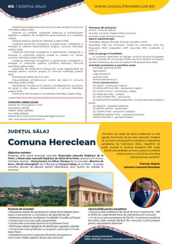 612 / JUDE%u021aUL S%u0102LAJ WWW.GHIDULPRIMARIILOR.ROModernizarea sistemului de iluminat public stradal, %u00een comuna Halm%u0103%u0219d, jude%u021bul S%u0103lajDotarea cu mobilier, materiale didactice %u0219i echipamente digitale a unit%u0103%u021bilor de %u00eenv%u0103%u021b%u0103m%u00e2nt preuniversitar %u0219i a unit%u0103%u021bilor conexeDotarea sediului primariei Halm%u0103%u0219d, jude%u021bul S%u0103lajCre%u0219terea eficien%u021bei energetice %u0219i gestionarea inteligent%u0103%u00a0 a energiei la cl%u0103direa administrativ%u0103%u00a0 Drighiu, comuna Halm%u0103%u0219d, jude%u021bul S%u0103lajCre%u0219terea eficien%u021bei energetice %u0219i gestionarea inteligent%u0103%u00a0 a energiei %u00een institu%u021biile publice, %u0219coala cu clasele I-IV, Cerisa, comuna Halm%u0103%u0219d, jude%u021bul S%u0103lajCre%u0219terea eficien%u021bei energetice %u0219i gestionarea inteligent%u0103%u00a0 a energiei %u00een institu%u021biile publice, prim%u0103ria Halm%u0103%u0219d, comuna Halm%u0103%u0219d, jude%u021bul S%u0103lajCapacit%u0103%u021bi de producere energie din surse regenerabile de energie, pentru consum propriu %u00een comuna Halm%u0103%u0219d, jude%u021bul S%u0103lajDezvoltarea re%u021belei de %u0219coli verzi%u00cembun%u0103t%u0103%u021birea infrastructurii rutiere de baz%u0103%u00a0 %u00een comuna Halm%u0103%u0219d, jude%u021bul S%u0103lajDezvoltarea infrastructurii pentru managementul gunoiului de grajd %u0219i altor de%u0219euri compostabile, %u00een comuna Halm%u0103%u0219d, jude%u021bul S%u0103lajConstruire Sal%u0103%u00a0de sport %u00een localitatea Halm%u0103%u0219d, jude%u021bul S%u0103lajCOMUNA HERECLEANAdres%u0103: Str. Principala nr. 27/ACod po%u0219tal: 457165Telefon: 0260-629480; Fax: 0260-629545; Adresa de e-mail: primariahereclean@yahoo.comURL: www.primariahereclean.roPersoane din primarie:Primar: Francisc DobraiSecretar General: Fize%u015fan Otilia-CosminaContabil: Laslo Mariana-Lenu%u0163aSate %u00een administra%u021bie:Hereclean, Badon, Boc%u0219i%u021ba, Dio%u0219od, Gurusl%u0103u, PanicSuprafa%u021ba:%u00a0 7163 ha; Intravilan:%u00a0 749,26 ha; Extravilan:%u00a0 6414 ha; Popula%u021bia:%u00a0 3941; Gospod%u0103rii:%u00a0 2317; Locuin%u021be:%u00a0 1974; Gr%u0103dini%u021be:%u00a0 4; %u0218coli:%u00a04; Cum se ajunge in localitate:%u00cen comuna Hereclean se ajunge urm%u00e2nd drumul European E81 de la ie%u0219irea din municipiul Zal%u0103u ,drumul na%u021bional 1H dinspre %u0218imleul Silvaniei,%u0219i drumul European E 81 dinspre Satu MareActivitati economice si specifice zonei:Activit%u0103%u0163i agroindustrialeAgricultur%u0103Legumicultur%u0103Cultur%u0103 marePrelucrarea lemnuluiFirme reprezentative:S.C.IAZUL - produc%u021bie ciuperciS.C.BOGLAR PLUS SRL - produc%u021bie ciuperciS.C.LAND UTILAJ - vulcanizare, utilajeSC DENI-ROX SRL - mobil%u0103SC.APICOFARM SRL - apicultur%u0103SC MERCATOR TRANSILVANIA SRL- comer%u021b vehicule transport publicSC.ONCOS - cre%u0219terea p%u0103s%u0103rilorSC.PENTA MEDIA - publicitateSC TEMPO PAM - prelucrari metaliceSZEREDAI KAROLY PFA - cre%u0219terea bovinelorNIMAN MAGDA II -%u00a0pompe funebre