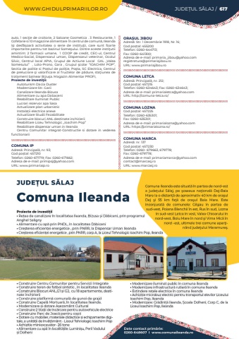 WWW.GHIDULPRIMARIILOR.RO JUDE%u021aUL S%u0102LAJ / 617auto, 1 sec%u0163ie de croitorie, 2 Saloane Cosmetica . 3 Restaurante, 1 Cofetarie si 10 magazine alimentare %u00a0%u00cen centrul de comun%u0103, Ileanda %u00ee%u015fi desf%u0103%u015foar%u0103 activitatea o serie de institu%u0163ii, care sunt foarte importante pentru tot bazinul Some%u015fului. Dintre aceste insti%u0163utii amintim: 2 farmacii umane, %u00a0 1 COOP de credit, CEC-ul, Centrul Medico-Social, Dispensarul uman, Dispensarul veterinar, Ocolul Silvic, Centrul local APIA, Grupul de Actiune Local %u00a0 GAL ,,Valea Somesului%u201d %u00a0 , Loto-Prono, Gara , Grupul %u015fcolar %u201cIOACHIM POP%u201d, Sectia de politie si Postul de poli%u0163ie, Po%u015fta, SC Electrica, Centrul de prelucrare %u015fi valorificare al fructelor de p%u0103dure, sta%u0163iunea de tratament balnear Bizu%u015fa. Magazin Alimentar PROFI,%u00a0%u00a0Proiecte de investi%u0163ii:Autoturism Dacia Duster%u00a0Modernizare Str. Garii%u00a0Canalizare Ileanda-Bizusa%u00a0Alimentare cu apa Dabaceni%u00a0Reabilitare Iluminat Public%u00a0Lucrari rezervor apa SasaActualizare plan urbanistic%u00a0Instala%u021bii electrice anexe%u00a0Actualizare Studii Fezabilitate%u00a0Construire blocuri ANL destinate inchirieriiReabilitare Liceu Tehnologic ,,Ioachim Pop%u201dReabilitare dispensar uman in IleandaCentru Comunitar integrat-Constructie si dotare in vederea functionariiCOMUNA IPAdres%u0103: Principal%u0103, nr. 93;Cod po%u0219tal: 457210Telefon: 0260-671719; Fax: 0260-671662; Adresa de e-mail: primipsj@yahoo.comURL: www.primariaip.roORA%u0218UL JIBOUAdres%u0103: Str. 1 Decembrie 1918, Nr. 16;Cod po%u0219tal: 455200Telefon: 0260-644713; Fax: 0260-641300; Adresa de e-mail: primaria_jibou@yahoo.comregistratura@primariajibou.roURL: www.primariajibou.roCOMUNA LETCAAdres%u0103: Principal%u0103, nr. 212; Cod po%u0219tal: 457215Telefon: 0260-634643; Fax: 0260-634643; Adresa de e-mail: primarialetca@yahoo.comURL: http://comuna-letca.ro/COMUNA LOZNACod po%u0219tal: 457225Telefon: 0260-635301; Fax: 0260-635301; Adresa de e-mail: primarialozna@yahoo.comURL: https://primarialozna.ro/COMUNA MARCAAdres%u0103: nr. 137Cod po%u0219tal: 457230Telefon: 0260- 679663, 679778; Fax: 0260-679778; Adresa de e-mail: primariamarca@yahoo.comcontact@marcasj.roURL: www.marcasj.ro