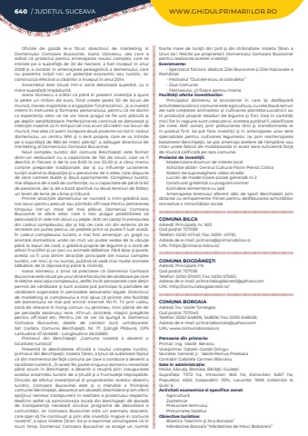 640 / JUDE%u021aUL SUCEAVA WWW.GHIDULPRIMARIILOR.ROOficiile de gazd%u0103 le-a f%u0103cut directorul de marketing al Domeniului Comoara Bucovinei, Ioana Voinescu, cea care a ar%u0103tat c%u0103 proiectul pentru amenajarea noului complex, care se %u00eentinde pe o suprafa%u0163%u0103 de 30 de hectare, a fost %u00eenceput %u00een anul 2008 %u015fi a constat %u00een amenajarea peisagistic%u0103 a domeniului, care nu prezenta ini%u0163ial nici un poten%u0163ial economic sau turistic, iar construc%u0163ia efectiv%u0103 a cl%u0103dirilor a %u00eenceput %u00een anul 2014.Ansamblul este situat %u00eentr-o zon%u0103 deluroas%u0103 superb%u0103, cu o mare suprafa%u0163%u0103 %u00eemp%u0103durit%u0103.Ioana Voinescu a ar%u0103tat c%u0103 p%u00e2n%u0103 %u00een prezent investi%u0163ia a ajuns la peste un milion de euro, fiind create peste 30 de locuri de munc%u0103, marea majoritate a angaja%u0163ilor fiind localnici. %u201eS-a investit intens %u00een instruirea %u015fi formarea personalului, pentru c%u0103 ne dorim ca experien%u0163a celor ce ne vor trece pragul s%u0103 fie una pl%u0103cut%u0103 %u015fi pe deplin satisf%u0103c%u0103toare. Perfec%u0163ionarea continu%u0103 se datoreaz%u0103 %u015fi inten%u0163iei noastre ca %u00een timpul cel mai scurt s%u0103 cre%u0103m noi locuri de munc%u0103, mai ales c%u0103 avem %u00eencepute dou%u0103 proiecte noi tot %u00een cadrul domeniului, un centru SPA %u015fi o ser%u0103 proprie, care se va %u00eentinde pe o suprafa%u0163%u0103 de 980 de metri p%u0103tra%u0163i%u201d, a ad%u0103ugat directorul de marketing al Domeniului Comoara Bucovinei.Noul complex turistic din comuna Berchi%u015fe%u015fti este format dintr-un restaurant cu o capacitate de 150 de locuri, care va fi deschis %u00een fiecare zi de la ora 8.00 la ora 22.00 %u015fi a c%u0103rui meniu con%u0163ine preparate tradi%u0163ionale, dar %u015fi cu influen%u0163e ucrainene, turi%u015ftii av%u00e2nd la dispozi%u0163ie %u015fi o pensiunea de 4 stele, care dispune de zece camere duble %u015fi dou%u0103 apartamente. Complexul turistic mai dispune de o sal%u0103 de conferin%u0163e, cu o capacitate de p%u00e2n%u0103 la 50 de persoane, dar %u015fi de o baz%u0103 sportiv%u0103 cu dou%u0103 terenuri de fotbal, un teren de tenis de c%u00e2mp %u015fi tribun%u0103Printre atrac%u0163iile domeniului se num%u0103r%u0103 o mini-gr%u0103din%u0103 zoo, trei iazuri pentru pescuit sau plimb%u0103ri off-road Pentru petrecerea timpului %u00eentr-un mod c%u00e2t mai pl%u0103cut, Domeniul Comoara Bucovinei le ofer%u0103 celor care %u00eei trec pragul posibilitatea s%u0103 pescuiasc%u0103 %u00een cele trei iazuri cu pe%u015fte. At%u00e2t cei caza%u0163i %u00een pensiunea din cadrul complexului, dar %u015fi to%u0163i cei care vin din exterior s%u0103 se recreeze vor putea pescui, iar pe%u015ftele prins va putea fi luat acas%u0103. %u00cen cadrul complexului turistic a mai fost amenajat un grajd cu animale domestice, unde cei mici vor putea vedea de la v%u0103cu%u0163e p%u00e2n%u0103 la iepuri de cas%u0103, o gr%u0103din%u0103 proprie de legume %u015fi o zon%u0103 de arbori fructiferi %u015fi un %u0163arc cu animale s%u0103lbatice. F%u0103r%u0103 doar %u015fi poate, acesta va fi una dintre atrac%u0163iile principale ale noului complex turistic, cei mici, %u015fi nu numai, put%u00e2nd s%u0103 vad%u0103 mai multe animale s%u0103lbatice, de la c%u0103prioare %u015fi p%u00e2n%u0103 la mistre%u0163i.Ioana Voinescu a %u0163inut s%u0103 precizeze c%u0103 Domeniul Comoara Bucovinei este situat pe unul dintre fondurile de v%u00e2n%u0103toare pe care le de%u0163ine asocia%u0163ia complexului, astfel %u00eenc%u00e2t persoanele care de%u0163in permis de v%u00e2n%u0103toare %u015fi sunt avizate pot participa la partidele de v%u00e2n%u0103toare organizate %u00een perioadele sezoanelor legale. Directorul de marketing al complexului a mai spus c%u0103 printre alte facilit%u0103%u0163i ale domeniului se mai pot aminti internet Wi-Fi, TV prin cablu, zon%u0103 de relaxare %u00een living comun cu %u015femineu, mini p%u00e2rtie de ski pe perioada sezonului rece, ATV-uri, biciclete, ma%u015fini preg%u0103tite pentru off-road etc. Pentru cei ce vor s%u0103 ajung%u0103 la Domeniul Comoara Bucovinei, datele de contact sunt urm%u0103toarele: Sat Corlata, Comuna Berchi%u015fe%u015fti, Nr. 17, (L%u00e2ng%u0103 P%u0103dure), GPS Latitudine 47.544669 - Longitudine: 26.02883 Primarul din Berchi%u015fe%u015fti: %u201eComuna noastr%u0103 a devenit o localitate turistic%u0103%u201dPrezent%u0103 la deschiderea oficial%u0103 a noului complex turistic, primarul din Berchi%u015fe%u015fti, Violeta %u0162%u0103ran, a %u0163inut s%u0103 sublinieze faptul c%u0103 din momentul de fa%u0163%u0103 comuna pe care o conduce a devenit o localitate turistic%u0103. %u201e%u00cen acest fel, poate singurul domeniu nerealizat p%u00e2n%u0103 acum %u00een Berchi%u015fe%u015fti a devenit o reu%u015fit%u0103 prin inaugurarea acestui ansamblu turistic de o %u0163inut%u0103 %u015fi o frumuse%u0163e irepro%u015fabile. Dincolo de efortul investi%u0163ional al proprietarilor acestui obiectiv turistic, Comoara Bucovinei este %u015fi o m%u00e2ndrie a Prim%u0103riei comunei Berchi%u015fe%u015fti, deoarece am dovedit deschidere %u015fi am oferit sprijinul necesar transpunerii %u00een realitate a proiectului respectiv. Reafirm astfel c%u0103 administra%u0163ia local%u0103 din Berchi%u015fe%u015fti d%u0103 dovad%u0103 de transparen%u0163a necesar%u0103 oric%u0103ror programe de dezvoltare a comunit%u0103%u0163ii, iar Comoara Bucovinei este un exemplu elocvent, care sper s%u0103 fie continuat %u015fi prin alte investi%u0163ii majore %u00een comuna noastr%u0103%u201d, a spus Violeta %u0162%u0103ran. Ea %u015fi-a exprimat convingerea c%u0103 %u00een scurt timp, Domeniul Comoara Bucovinei va atrage un num%u0103r foarte mare de turi%u015fti din %u0163ar%u0103 %u015fi din str%u0103in%u0103tate. Violeta %u0162%u0103ran a %u0163inut s%u0103-i felicite pe proprietarii Domeniului Comoara Bucovinei pen