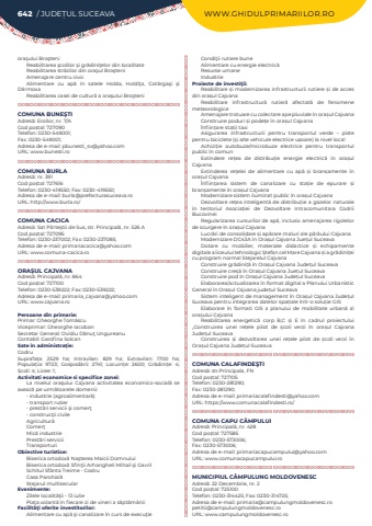 642 / JUDE%u021aUL SUCEAVA WWW.GHIDULPRIMARIILOR.ROora%u015fului Bro%u015fteniReabilitarea %u015fcolilor %u015fi gr%u0103dini%u0163elor din localitateReabilitarea str%u0103zilor din ora%u015ful Bro%u015fteniAmenajare centru civicAlimentare cu ap%u0103 %u00een satele Holda, Holdi%u0163a, Cot%u00e2rga%u015fi %u015fi D%u00e2rmoxaReabilitarea casei de cultur%u0103 a ora%u015fului Bro%u015fteniCOMUNA BUNE%u015eTIAdres%u0103: Eroilor, nr. 7/ACod po%u0219tal: 727090Telefon: 0230-549001; Fax: 0230-549001; Adresa de e-mail: pbunesti_sv@yahoo.comURL: www.bunesti.roCOMUNA BURLAAdres%u0103: nr. 391Cod po%u0219tal: 727616Telefon: 0230-419550; Fax: 0230-419550; Adresa de e-mail: burla@prefecturasuceava.roURL: http://www.burla.ro/COMUNA CACICAAdres%u0103: Sat P%u00e2rte%u015ftii de Sus, str. Principal%u0103, nr. 526 ACod po%u0219tal: 727095Telefon: 0230-237002; Fax: 0230-237085; Adresa de e-mail: primariacacica@yahoo.comURL: www.comuna-cacica.roORA%u0218UL CAJVANAAdres%u0103: Principal%u0103, nr. 864Cod po%u0219tal: 727100Telefon: 0230-539222; Fax: 0230-539222; Adresa de e-mail: primaria_cajvana@yahoo.comURL: www.cajvana.roPersoane din primarie:Primar: Gheorghe Tom%u0103scu%u00a0Viceprimar: Gheorghe Iacoban%u00a0Secretar General: Ovidiu D%u0103nu%u0163%u00a0UngureanuContabil: Garofina SolcanSate %u00een administra%u021bie:CodruSuprafa%u021ba:%u00a0 2529 ha; Intravilan:%u00a0 829 ha; Extravilan:%u00a0 1700 ha; Popula%u021bia:%u00a0 9723; Gospod%u0103rii:%u00a0 2741; Locuin%u021be:%u00a0 2600; Gr%u0103dini%u021be:%u00a0 4; %u0218coli:%u00a04; Licee:%u00a01; Activitati economice si specifice zonei:La nivelul ora%u015fului Cajvana activitatea economico-social%u0103 se axeaz%u0103 pe urm%u0103toarele domenii:%u00a0- industrie (agroalimentar%u0103)- transport rutier- prest%u0103ri servicii %u015fi comer%u0163- construc%u0163ii civileAgricultur%u0103Comer%u0163Mic%u0103 industriePrest%u0103ri serviciiTransporturiObiective turistice:Biserica ortodox%u0103 Na%u015fterea Maicii DomnuluiBiserica ortodox%u0103 Sfin%u0163ii Arhangheli Mihail %u015fi GavrilSchitul Sf%u00e2nta Treime - CodruCasa Parohial%u0103Stejarul multisecularEvenimente:Zilele localit%u0103%u0163ii - 13 iuliePia%u0163a volant%u0103 %u00een fiecare zi de vineri a s%u0103pt%u0103m%u00e2niiFacilit%u00e3%u0163i oferite investitorilor:Alimentare cu ap%u0103 %u015fi canalizare %u00een curs de execu%u0163ieCondi%u0163ii rutiere buneAlimentare cu energie electric%u0103Resurse umaneIndustrieProiecte de investi%u0163ii:Reabilitare %u0219i modernizarea infrastructurii rutiere %u0219i de acces din ora%u0219ul CajvanaReabilitare infrastructur%u0103 rutier%u0103 afectat%u0103 de fenomene meteorologiceAmenajare trotuare cu colectare ape pluviale %u00een ora%u0219ul CajvanaConstruire poduri %u0219i pode%u021be %u00een ora%u0219ul Cajvana%u00cenfiin%u021bare sta%u021bii taxiAsigurarea infrastructurii pentru transportul verde %u2013 piste pentru biciclete (%u0219i alte vehicule electrice u%u0219oare) la nivel localAchizi%u021bie autobuze/microbuze electrice pentru transportul public %u00een comunExtindere re%u021bea de distribu%u021bie energie electric%u0103 %u00een ora%u0219ul CajvanaExtinderea re%u021belei de alimentare cu ap%u0103 %u0219i bran%u0219amente %u00een ora%u0219ul Cajvana%u00cenfiin%u021barea sistem de canalizare cu sta%u021bie de epurare %u0219i bran%u0219amente %u00een ora%u0219ul CajvanaModernizare sistem iluminat public %u00een ora%u0219ul CajvanaDezvoltare re%u021bea inteligent%u0103 de distribu%u021bie a gazelor naturale %u00een teritoriul Asocia%u021biei de Dezvoltare Intracomunitara Codrii BucovineiRegularizarea cursurilor de ap%u0103, inclusiv amenajarea rigolelor de scurgere %u00een ora%u0219ul CajvanaLucr%u0103ri de consolidare %u0219i ap%u0103rare maluri ale p%u00e2r%u00e2ului CajvanaModernizare DC43A %u00een Ora%u0219ul Cajvana Jue%u021bul%u00a0SuceavaDotare cu mobilier, materiale didactice %u0219i echipamente digitale a liceului tehnologic %u0218tefan cel Mare Cajvana %u0219i a gr%u0103dini%u021bei cu program normal Stejarelul CajvanaConstruire gr%u0103dini%u021b%u0103%u00a0%u00een Ora%u0219ul Cajvana Jude%u021bul SuceavaConstruire cre%u0219%u0103%u00a0%u00een Ora%u0219ul Cajvana Jue%u021bul%u00a0SuceavaConstruire pod %u00een Ora%u0219ul Cajvana Jude%u021bul SuceavaElaborarea/actualizarea %u00een format digital a Planului Urbanistic General %u00een Ora%u0219ul Cajvana jude%u021bul SuceavaSistem inteligent de management %u00een Ora%u0219ul Cajvana Jude%u021bul Suceava pentru integrarea datelor spa%u021biale %u00eentr-o solu%u021bie GISElaborare %u00een formati GIS a planului de mobilitate urban%u0103%u00a0 al ora%u0219ului CajvanaReabilitarea energetic%u0103%u00a0 corp B,C %u0219i E %u00een cadrul proiectului %u201eConstruirea unei re%u021bele pilot de %u0219coli verzi %u00een ora%u0219ul Cajvana Jude%u021bul SuceavaConstruirea %u0219i dezvoltarea unei re%u021bele pilot de %u0219coli verzi %u00een Ora%u0219ul Cajvana Jude%u021bul SuceavaCOMUNA CALAFINDE%u015eTIAdres%u0103: str.Principala, FNCod po%u0219tal: 727105Telefon: 0230-281290; Fax: 0230-281290; Adresa de e-mail: primariacalafindesti@yahoo.comURL: https://www.comunacalafindesti.ro/COMUNA CAPU C%u00c2MPULUIAdres%u0103: Principal%u0103, nr. 428Cod po%u0219tal: 727585Telefon: 0230-573006; Fax: 0230-573006; Adresa de e-mail: primariacapucampului@yahoo.comURL: www.comunacapucampului.roMUNICIPIUL C%u00c2MPULUNG MOLDOVENESCAdres%u0103: 22 Decembrie, nr. 2Cod po%u0219tal: 725100Telefon: 0230-314425; Fax: 0230-314725; Adresa de e-mail: primaria@campulungmoldovenesc.ropetitii@campulungmoldovenesc.roURL: www.campulungmoldovenesc.ro