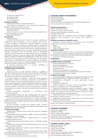 644 / JUDE%u021aUL SUCEAVA WWW.GHIDULPRIMARIILOR.ROSC Bucovina Bejenar SRLSC Casymyha SRLSC Panedor SRLP.F.A.%u00a0 H%u00eerceag AlinObiective turistice:Obiectivele turistice mai importante sunt:Monumentul comemorativ care aminte%u0219te de trecerea lui Bogdan I (1359) prin aceast%u0103 comun%u0103Rezerva%u0163ia geologic%u0103 %u201cPiatra %u0162ib%u0103ului%u201dRezerva%u021bia %u201cLala%u201dCele trei biserici de pe teritoriul comunei care apar%u021bin celor dou%u0103 culte: ortodox %u0219i catolicMonumentul eroilorEvenimente:Zilele C%u00e2rlibabei%u00cen fiecare an pe data de 29 iunie %u00een comuna C%u00e2rlibaba se s%u0103rb%u0103toresc Zilele localit%u0103%u021bii %u0219i Hramul Bisericii Sfin%u021bii Petru %u0219i Pavel.%u00a0 Programul manifest%u0103rii cuprinde diferite momente artistice de c%u00e2ntece %u0219i dansuri de diferite genuri. Spectacolul folcloric este oferit at%u00e2t de ansamblul local c%u00e2t %u0219i de arti%u0219ti sau ansambluri renumite, invitate la eveniment. Aceast%u0103 manifestare este un prilej de %u00eent%u00e2lnire %u00eentr-un cadru de s%u0103rb%u0103toare, pentru membrii comunit%u0103%u021bii Hora la Rotunda. Este un eveniment organizat de dou%u0103 comune din dou%u0103 jude%u021be: comuna C%u00e2rlibaba din jude%u021bul Suceava %u0219i comuna M%u0103gura Ilvei din jude%u021bul Bistri%u021ba N%u0103s%u0103ud. Aceast%u0103 manifestare se desf%u0103%u0219oar%u0103 %u00een fiecare an %u00een prima duminic%u0103 din luna august pe V%u00e2rful Rotunda. Cei doi primari organizeaz%u0103 manifestarea pentru a p%u0103stra leg%u0103tura de prietenie dintre comune %u0219i a pune %u00een valoare folclorul specific fiec%u0103rei localit%u0103%u021bi care de%u0219i %u00eenvecinate sunt totu%u0219i diferite%u00cen perioada februarie-martie ,%u00een comuna C%u00e2rlibaba se organizeaz%u0103 %u201dSerb%u0103rile z%u0103pezii%u201eFacilit%u00e3%u0163i oferite investitorilor:Oportunit%u0103%u021bi:Faptul c%u0103 zona nu este poluat%u0103, precum %u0219i bog%u0103%u021bia %u0219i diversificata flor%u0103 spontan%u0103, fac oportune investi%u021biile %u00een dezvoltarea apiculturii, fiind necesare investi%u021bii pentru dotarea cu un centru de colectare %u0219i valorificare a produselor apicoleSe pot amenaja %u00een comun%u0103: - centre de t%u0103iere, abatoare, carmangerii, unit%u0103%u021bi de colectare, prelucrare %u0219i valorificare a laptelui, a pieilor, a l%u00e2nii etc, produsele ob%u021binute pe raza comunei fiind integral biologice - %u00eentinsele suprafe%u021be acoperite de p%u0103duri (24.700 ha) asigur%u0103 suficiente cantit%u0103%u021bi de fructe de p%u0103dure, ciuperci %u0219i plante medicinale %u00eenc%u00e2t s%u0103 fac%u0103 oportune investi%u021biile %u00een%u00a0amenajarea unui centru de colectare, prelucrare %u0219i valorificare a acestoraExist%u0103 opotunitatea investi%u021biilor %u00een amenajarea unor microhidrocentraleNumeroasele izvoare de ape carbogazoase fac oportune investi%u021biile %u00een amenajarea unei sta%u021bii de %u00eembuteliere a acestoraPot fi amenajate %u00een zon%u0103 ateliere de mic mobilier, t%u00e2mpl%u0103rie, profile din lemn, construc%u021bii case din lemn, mobilier de gr%u0103din%u0103, sculptur%u0103 din lemn, exist%u00e2nd for%u021b%u0103 de munc%u0103 calificat%u0103 %u0219i tradi%u021bie %u00een aceste domeniiSe pot amenaja %u0219i ateliere de confec%u021bii textile, confec%u021bii %u00eenc%u0103l%u021b%u0103minte, artizanat, domenii ale industriei u%u0219oare pentru care exist%u0103 for%u021b%u0103 de munc%u0103 calificat%u0103Proiecte de investi%u0163ii:Modernizare %u0219i dotare c%u0103min cultural din comuna C%u00e2rlibaba, jude%u021bul SuceavaModernizare %u0218coala Gimnazial%u0103 ,,%u0218tefan cel Mare%u201d %u0219i gr%u0103dini%u021ba cu program normal C%u00e2rlibaba%u00cenfiin%u021bare centru comunitar multifunc%u021bional %u00een comuna C%u00e2rlibaba, jude%u021bul SuceavaModernizare drumuri comunale %u00een comuna C%u00e2rlibaba, jude%u021bul SuceavaModernizare infrastructur%u0103%u00a0rutier%u0103 de interes local %u00een comuna C%u00e2rlibaba, jude%u021bul SuceavaModernizare sistem de iluminat public stradal %u00een comuna C%u00e2rlibaba, jude%u021bul SuceavaConstruc%u021bia %u0219i dotarea infrastructurii sportive asociate unit%u0103%u021bii de %u00eenv%u0103%u021b%u0103m%u00e2nt din cadrul %u0218colii Gimnaziale ,,%u0218tefan cel Mare,, din Comuna C%u00e2rlibaba, jude%u021bul SuceavaConstruc%u021bia a dou%u0103 sta%u021bii de autobuz moderneCOMUNA CIPRIAN PORUMBESCUCod po%u0219tal: 727125Telefon: 0230-551662; Fax: 0372-368570; Adresa de e-mail: primariaciprianporumbescusv@yahoo.comURL: www.ciprian-porumbescu.roPersoane din primarie:Primar: Nimi%u0163ean DumitruViceprimar: Ciprian Ionu%u021b Hancean%u00a0Secretar General:R%u00e2ule%u0163-Constantin Covrig%u00a0Contabil:%u00a0Elena%u00a0 Rusu%u00a0Suprafa%u021ba:%u00a0 3056 ha; Intravilan:%u00a0 190 ha; Extravilan:%u00a0 2866 ha; Popula%u021bia:%u00a0 2130; Gospod%u0103rii:%u00a0 781; Locuin%u021be:%u00a0 781; Gr%u0103dini%u021be:%u00a0 1; %u0218coli:%u00a01; Activitati economice si specifice zonei:Specificul comunei Ciprian Porumbescu este cel agricol, aceasta fiind ocupa%u0163ia principal%u0103 a locuitorilorMoar%u0103Atelier autoAtelier de debitare lemnObiective turistice:Zona poate fi de interes turistic, ceea ce permite %u015fi dezvoltareaComuna remarcat%u0103 prin prezen%u0163a complexului muzeal Ciprian Porumbescu compus din: Casa Memorial%u0103 %u015fi Muzeul MemorialMorm%u00e2ntul familiei PorumbescuEvenimente:Ziua comunei - %u00een prima duminic%u0103 din iulieFacilit%u00e3%u0163i oferite investitorilor:Exist%u0103 posibilitatea de a %u00eenfiin%u0163a:Silozuri de depozitareCentre de mor%u0103rit %u015fi panifica%u0163ie%u00cengr%u0103%u015f%u0103torie porciFerme mixte de cre%u015ftere a animalelorPuncte de valorificare a produselor ob%u0163inute de la animaleSuprafe%u0163e de teren pentru investi%u0163iiProiecte de investi%u0163ii:Const