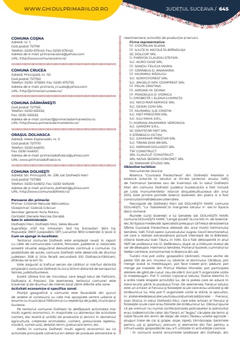 WWW.GHIDULPRIMARIILOR.RO JUDE%u021aUL SUCEAVA / 645COMUNA CO%u015eNAAdres%u0103: nr. 1;Cod po%u0219tal: 727191Telefon: 0230-575142; Fax: 0230-575142; Adresa de e-mail: primariacosna@yahoo.comURL: http://www.comunacosna.ro/COMUNA CRUCEAAdres%u0103: Principal%u0103, nr. 151Cod po%u0219tal: 727150Telefon: 0230- 575591; Fax: 0230-575733; Adresa de e-mail: primaria_crucea@yahoo.comURL: http://primariacruceasv.ro/COMUNA D%u0102RM%u0102NE%u015eTICod po%u0219tal: 727155Telefon: 0230-551532; Fax: 0230-551532; Adresa de e-mail: contact@primariadarmanestisv.roURL: http://www.primariadarmanestisv.ro/ORA%u0218UL DOLHASCAAdres%u0103: Aleea Esplanadei, nr. 5Cod po%u0219tal: 727170Telefon: 0230-546101; Fax: 0230-546101; Adresa de e-mail: primariadolhasca@yahoo.comURL: www.primariadolhasca.roCOMUNA DOLHE%u015eTIAdres%u0103: Str. Principal%u0103, Nr. 339, sat Dolhe%u0219tii MariCod po%u0219tal: 727180Telefon: 0230-549212; Fax: 0230-549249; Adresa de e-mail: primaria_dolhesti@yahoo.comURL: http://www.comunadolhesti.ro/Persoane din primarie:Primar: Cristinel-Neculai B%u0103rculescuViceprimar: Costic%u0103 Cr%u0103ciunSecretar general: Nina RotaruContabil: Daniela Narcisa Darab%u0103Sate %u00een administra%u021bie:Dolhe%u015ftii Mari, Dolhe%u015ftii Mici, Valea BoureiSuprafa%u021ba:%u00a0 4157 ha; Intravilan:%u00a0 543 ha; Extravilan:%u00a0 3614 ha; Popula%u021bia:%u00a03907; Gospod%u0103rii:%u00a01371; Locuin%u021be:%u00a01810; Gr%u0103dini%u021be:%u00a03; %u0218coli:%u00a03; Cum se ajunge in localitate:Teritoriul comunei Dolhe%u0219ti este amplasat reu%u0219it %u00een raport cu c%u0103ile de comunica%u021bie rutiere, feroviare, jude%u021bene %u0219i na%u021bionale,%u00a0 aceast%u0103 situa%u021bie asigur%u00e2nd dezvoltarea continu%u0103 a comunei. Ca posibilitate de acces, comuna Dolhe%u0219ti este deservit%u0103 de drumul jude%u021bean 208 %u0219i linia ferat%u0103 secundar%u0103 510 Dolhasca-F%u0103lticeni, afl%u00e2ndu-se la km 10.Este asigurat %u0219i traficul aerian de c%u0103l%u0103tori %u0219i m%u0103rfuri datorit%u0103 amplas%u0103rii comunei Dolhe%u0219ti la circa 50 km distan%u021b%u0103 de aeroportul Salcea, jude%u021bulSuceava. Exist%u0103 c%u00e2teva linii de microbuz care leag%u0103 satul de Falticeni, Dolhasca %u0219i Pa%u0219cani. De asemenea, teritoriul comunei este traversat %u0219i de drumuri de interes local c%u0103tre diferite alte zone.Activitati economice si specifice zonei:Pozi%u0163ia geografic%u0103 a comunei este favorabil%u0103 din punct de vedere al conexiunii cu cele mai apropiate centre urbane %u015fi anume cu municipiul F%u0103lticeni %u015fi cu re%u015fedin%u0163a de jude%u0163, municipiul Suceava.Pe teritoriul comunei Dolhe%u0219ti %u00ee%u0219i desf%u0103%u0219oar%u0103 activitatea mai mul%u021bi agen%u021bi economici, %u00een majoritate cu domeniul de activitate comer%u021b, dar exist%u0103 %u0219i unit%u0103%u021bi de produc%u021bie %u0219i servicii %u00een domeniul agricultur%u0103, cre%u015fterea animalelor, comer%u0163, prelucrarea laptelui, mor%u0103rit, construc%u0163ii, debitat lemn, prelucrare lemn, etc.Astfel, %u00een comuna Dolhe%u0219ti multi agen%u021bi economici au ca activitate principal%u0103 comer%u021bul en-detail de produse alimentare %u0219i nealimentare, activit%u0103%u021bi de produc%u021bie %u0219i servicii.Firme reprezentative:%u00ce.F. CIOC%u00ceRLAN ELENA%u00ce.F. ILIU%u021aE N. NICOLETA BR%u00ceNDU%u0218ASC DOLCOP SRL%u00ce.I. PARDOS CLAUDIU %u0218TEFANS.C. AGRO CASE SRL%u00ce.F. SANDU FELICIA MARIA%u00ce.F. C%u0102R%u0102BU%u0218 D. ANAMARIA%u00ce.F. MURARIU R%u0102DUCUS.C. SONYCFOREST SRLS.C. ANGELO-MIH COMPREST SRL %u00ce.F. PELIN CRISTINA%u00ce.F. AIROAEI M. DOINA%u00ce.F. PANDELEA D. VIORICA %u00ce.I. DROBOT%u0102 I. ELENA-LUMINI%u021aA S.C. NICO-RAR SERVICE SRLS.C. CENIN COM SRL%u00ce.F. MURARIU ILIE CRISTINS.C. MET-PREST%u0102RI SRLS.C. IULI-MIHA S.R.L.%u00ce.I. MARIAN ANAMARIA VERONICAS.C. GARIZIM S.R.L.SC DAVYSTAR MET SRLII ST%u0102NESCU OCTAVS.C. GAMIMAR PRESTAR SRL S.C. TRANS EMA 89 SRLS.C. MIRMAR DOLHE%u0218TI SRLTSF CONSTRUCTSRL CLAUGUT CONSTRUCT SRL NOVA SEDENI CONCRET SRL SC RANMAR STUDIO SRLObiective turistice:Monumente istorice: Biserica %u201cCuvioasa Parascheva%u201d din Dolhe%u0219tii Mareste o biseric%u0103 ctitorit%u0103 %u00een secolul al XV-lea (anterior anului 1481) de hatmanul %u0218endrea sau de %u00eenainta%u0219ii s%u0103i %u00een satul Dolhe%u0219tii Mari din comuna Dolhe%u0219ti (jude%u021bul Suceava).Ea a fost inclus%u0103 pe Lista monumentelor istorice dinjude%u021bulSuceava din anul 2015, Este printre primele biserici boieresti din piatra si a fost construitain1481deboierulSendrea.Necropola de Dolhe%u015ftii Mari sat DOLHE%u015eTII MARI; comuna DOLHE%u015eTI, %u201cLa Todoreasa%u201d,la marginea satului V- sec.IV Epoca daco-roman%u0103Ruinele cur%u0163ii boiere%u015fti a lui %u015eendrea sat DOLHE%u015eTII MARI; comuna DOLHE%u015eTII MARI, %u201cL%u00e2ng%u0103 %u015fcoal%u0103%u201d la cca.100 m%u00a0 de biseric%u0103sec.XV Epoca medieval%u0103. Speciali%u0219tii presupun c%u0103 fresca de la biserica Sf%u00e2nta Cuvioas%u0103 Parascheva dateaz%u0103 din anul mor%u021bii hatmanului %u0218endrea, 1481, fiind opera cunoscutului zugrav Gavril Ieromonahul, cel care a realizat extraordinara pictur%u0103 interioar%u0103 de la B%u0103line%u0219ti, ctitoria boierului Ioan T%u0103utu, %u00een 1494. Ea a fost descoperit%u0103 %u00een anul 1927 de profesorul Ion D. %u0218tef%u0103nescu, dup%u0103 ce a %u00eenl%u0103turat stratul de var de deasupra. Hatmanul Sendrea, Portarul Sucevei, cumnatul lui Stefan cel Mare, inmormantat in Biserica din sat.Turi%u0219tii mai pot vizita: gospod%u0103rii %u021b%u0103r%u0103ne%u0219ti, moara veche de peste 100 de ani, muzeul cu obiecte al domnului C%u0103r%u0103bu%u0219, pot merge acas%u0103 la me%u0219te%u0219ugari, pot face trasee prin p%u0103dure, pot merge pe traseele din Primul R%u0103zboi Mondial, pot participala ateliere de g%u0103tit,de cusut%u00a0 sau de ol%u0103rit. Aici pot f