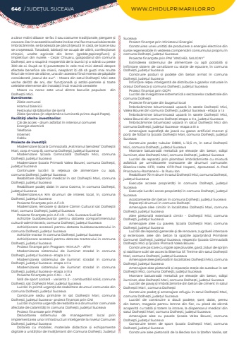 646 / JUDE%u021aUL SUCEAVA WWW.GHIDULPRIMARIILOR.ROa%u00a0c%u0103ror m%u00e2ini dibace%u00a0 se fac ii sau costume tradi%u0163ionale, %u015ftergare %u0219i covoare. Dar %u00een aceast%u0103 localitate %u00eenc%u0103 se mai fac manual obiecte de %u00eembr%u0103c%u0103minte, se brodeaz%u0103 pe p%u00e2nz%u0103 %u0163esut%u0103 %u00een cas%u0103, se toarce sau se cro%u015feteaz%u0103. Totodat%u0103, b%u0103rba%u0163ii se ocup%u0103 de ol%u0103rit, confec%u0163ionat chirpici, unelte agricole din lemn (greble,%u0163apine%u015fifurci) %u015fi %u00eempletituri din nuiele. - Cezar Chiuaru, gospodarul din comuna Dolhe%u0219ti, are o stupin%u0103 mo%u015ftenit%u0103 de la bunici %u015fi o st%u00e2n%u0103 cu peste 300 de oi. Dup%u0103 ce %u00ee%u021bi poveste%u0219te %u00een cele mai mici detalii despre efectele benefice ale mierii, neap%u0103rat %u00ee%u021bi d%u0103 s%u0103 gu%u0219ti mai multe feluri de miere de albine, una din acestea fiind mierea de p%u0103p%u0103die considerat%u0103 %u201eleacul de aur%u201c. - Moara din satul Dolhe%u015ftii Mici este veche de100 de ani, dar func%u0163ional%u0103 %u015fi ast%u0103zi-pietrele %u0219i toate celelalte elemente din instala%u021bii %u00eenc%u0103 macin%u0103 cerealeleMoara cu noroc este unul dintre barurile populare%u00a0 din Dolhe%u0219tii Mici.Evenimente:Zilele comuneiHramul bisericiiFestivalul s%u0103rb%u0103torilor de iarn%u0103 Zilele %u015eendrea (%u00een s%u0103pt%u0103m%u00e2na luminat%u0103-prima dup%u0103 Pa%u015fte).Facilit%u00e3%u0163i oferite investitorilor:C%u0103i de acces - drum asfaltat %u00een interiorul comuneiEnergie electric%u0103TelefonieInternetCabluProiecte de investi%u0163ii:Modernizare %u0218coala Gimnazial%u0103 %u201eHatmanul %u0218endrea%u201d Dolhe%u015ftii Mari, corp A+corp B, comuna Dolhe%u015fti, jude%u0163ul SuceavaModernizare %u0218coala Gimnazial%u0103 Dolhe%u015ftii Mici, comuna Dolhe%u015fti, jude%u0163ul SuceavaModernizare %u0218coala Primar%u0103 Valea Bourei, comuna Dolhe%u015fti, jude%u0163ul SuceavaContinuare lucr%u0103ri la re%u0163eaua de alimentare cu ap%u0103, comuna%u00a0Dolhe%u015fti, jude%u0163ul SuceavaReabilitare dispensar medical %u00een sat Dolhe%u015ftii Mari, comuna Dolhe%u015fti, jude%u0163ul SuceavaReabilitare pode%u0163 dalat %u00een zona Cosma, %u00een comuna Dolhe%u015fti, jude%u0163ul SuceavaModernizare,4,4 Km drumuri de interes local, %u00een, comuna Dolhesti, jude%u0163ul SuceavaProiecte finan%u0163ate prin A.F.I.R.Modernizare, renovare %u0219i%u00a0dotare C%u0103min Cultural sat Dolhe%u015ftii Mari, comuna Dolhe%u015fti, jude%u0163ul SuceavaProiecte finan%u0163ate prin A.F.I.R. %u2013 GAL Suceava Sud EstAchizi%u021bie buldoexcavator pentru dotarea compartimentului cultur%u0103-administrativ, comuna Dolhe%u0219ti, jude%u021bul SuceavaAchizi%u021bionare accesorii pentru dotarea buldoexcavatorului %u00een comuna Dolhe%u0219ti, jude%u021bul SuceavaAchizi%u021bie tractor %u00een comuna Dolhe%u0219ti, jude%u021bul SuceavaAchizi%u021bionare accesorii pentru dotarea tractorului in comuna Dolhe%u0219ti, jude%u021bul SuceavaProiect finan%u0163at prin Program -M.M.A.P. - AFMModernizarea sistemului de iluminat stradal %u00een comuna Dolhe%u015fti, jude%u0163ul Suceava- etapa a I aModernizarea sistemului de iluminat stradal %u00een comuna Dolhe%u015fti, jude%u0163ul Suceava- etapa a II aModernizarea sistemului de iluminat stradal %u00een comuna Dolhe%u015fti, jude%u0163ul Suceava- etapa a III aProiecte finan%u0163ate prin C.N.I. %u2013 S.ASal%u0103 de sport %u0219colar%u0103 - varianta 2 - combustibil solid, comuna Dolhe%u0219ti, sat Dolhe%u0219tii Mari, jude%u021bul SuceavaLucr%u0103ri %u00een prim%u0103 urgen%u0163a de reabilitare drumuri comunale din comuna Dolhe%u0219ti, jude%u021bul SuceavaConstruire sediu prim%u0103rie %u00een sat Dolhe%u0219tii Mari, comuna Dolhe%u0219ti, jude%u021bul Suceava- proiect finan%u021bat prin CNILucr%u0103ri %u00een prima urgen%u021b%u0103 de reabilitare a drumurilor comunale afectate de calamit%u0103%u021bi %u00een comuna Dolhe%u0219ti, jude%u021bul SuceavaProiect finantate prin PNNRDezvoltarea sistemului de management local prin implementarea unor infrastructuri inteligente la nivelul Comunei Dolhe%u0219ti, jude%u021bul SuceavaDotarea cu mobilier, materiale didactice %u0219i echipamente digitale a unit%u0103%u021bilor de %u00eenv%u0103%u021b%u0103mant din Comuna Dolhe%u0219ti, Jude%u021bul SuceavaProiect finan%u0163at prin Ministerul EnergieiConstruirea unei unit%u0103%u021bi de producere a energiei electrice din surse regenerabile %u00een vederea compens%u0103rii consumului propriu %u00een comuna Dolhe%u0219ti, jude%u021bul SuceavaProiecte finan%u0163ate prin PNI %u201dANGHEL SALIGNY%u201dExtinderea sistemului de alimentare cu ap%u0103 potabil%u0103 %u0219i %u00eenfiin%u021bare sistem de canalizare cu sta%u021bie de epurare, %u00een comuna Dolhe%u0219ti, jude%u021bul SuceavaConstruire poduri %u0219i pode%u021be din beton armat %u00een comuna Dolhe%u0219ti, jude%u021bul Suceava%u00cenfiin%u021bare re%u0163ea inteligent%u0103 de distribu%u021bie a gazelor naturale %u00een ora%u0219ul Dolhasca %u0219i comuna Dolhe%u0219ti, jude%u021bul SuceavaProiect finan%u021bat prin OCPILucr%u0103ri de %u00eenregistrare sistematic%u0103 a sectoarelor cadastrale din comuna Dolhe%u0219tiProiecte finan%u0163ate din bugetul local%u00cembr%u0103c%u0103minte bituminoas%u0103 u%u0219oar%u0103 %u00een satele Dolhe%u0219tii Mici, Valea Bourei din comuna Dolhe%u0219ti, jude%u021bul Suceava - etapa a I a%u00cembr%u0103c%u0103minte bituminoas%u0103 u%u0219oar%u0103 %u00een satele Dolhe%u0219tii Mici, Valea Bourei din comuna Dolhe%u0219ti etapa a II a, jude%u021bul Suceava%u00cembr%u0103c%u0103minte bitumioas%u00ee%u00a0 u%u0219oar%u0103%u00a0 %u00een satul Dolhe%u0219tii Mici din comuna Dolhe%u0219ti, jude%u021bul Suceava- etapa a III aAmenajare suprafa%u0163%u0103 de joac%u0103 cu gazon artificial marcat %u015fi por%u0163i de fotbal la %u015ecoala Dolhe%u015ftii Mari, comuna Dolhe%u015f