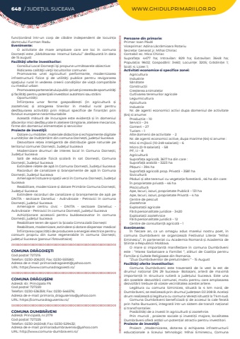 648 / JUDE%u021aUL SUCEAVA WWW.GHIDULPRIMARIILOR.ROfunc%u021bion%u00e2nd %u00eentr-un corp de cl%u0103dire independent de locuin%u021ba domnului Furman RaduEvenimente:O activitate de mare amploare care are loc %u00een comuna Dorne%u0219ti este ,,S%u0103rb%u0103toarea- Hramul Satului%u2019%u2019 desf%u0103%u0219urat%u0103%u00a0%u00een data de 15 augustFacilit%u00e3%u0163i oferite investitorilor:Consiliul Local Dorne%u015fti %u00ee%u015fi propune urm%u0103toarele obiective:Ridicarea calit%u0103%u0163ii vie%u0163ii locuitorilor comuneiPromovarea unei agriculturi performante, modernizarea infrastructurii fizice %u015fi de utilit%u0103%u0163i publice pentru revigorarea spa%u0163iului rural %u00een vederea creerii condi%u0163iilor de via%u0163%u0103 compatibile cu mediul urbanPromovarea parteneriatului public-privat %u015fi crearea de oportunit%u0103%u0163i %u015fi facilit%u0103%u0163i pentru poten%u0163ialii investitori autohtoni sau str%u0103iniOportunit%u0103%u021bi:%u00cenfiin%u021barea unor ferme gospod%u0103re%u0219ti (%u00een agricultur%u0103%u00a0 %u0219i zootehnie) %u0219i atragerea tinerilor %u00een mediul rural pentru desf%u0103%u0219urarea activit%u0103%u021bii prin m%u0103suri specifice de finan%u021b%u0103ri prin fonduri europene nerambursabileAceast%u0103%u00a0 m%u0103sur%u0103%u00a0 de %u00eencurajare este eviden%u021b%u0103%u00a0 %u0219i %u00een domeniul afacerilor mici desf%u0103%u0219urate %u00een ateliere t%u00e2mplarie, ateliere mecanice, firme din domeniul alimenta%u021biei %u0219i serviciilorProiecte de investi%u0163ii:Dotare cu mobilier, materiale didactice %u0219i echipamente digitale a unit%u0103%u021bilor de %u00eenv%u0103%u021b%u0103m%u00e2nt din comuna Dorne%u0219ti, jude%u021bul SuceavaDezvoltare re%u021bea inteligent%u0103 de distribu%u021bie gaze naturale pe teritoriul comunei Dorne%u0219ti, Jude%u0163ul SuceavaModernizare drumuri de interes local %u00een Comuna Dorne%u0219ti, Jude%u0163ul SuceavaSal%u0103 de educa%u021bie fizic%u0103 %u0219colar%u0103 %u00een sat Dorne%u0219ti, Comuna Dorne%u0219ti, Jude%u0163ul SuceavaExtindere re%u021bele de ap%u0103 %u00een Comuna Dorne%u0219ti, Jude%u0163ul SuceavaRacorduri de canalizare %u0219i bran%u0219amente de ap%u0103 %u00een Comuna Dorne%u0219ti, Jude%u0163ul SuceavaAmenajare trotuare %u0219i spa%u021bii verzi %u00een Comuna Dorne%u0219ti, Jude%u0163ul SuceavaReabilitare, modernizare %u0219i dotare Prim%u0103rie Comuna Dorne%u0219ti, Jude%u0163ul SuceavaExtindere racorduri de canalizare %u0219i bran%u0219amente de ap%u0103 pe DN17A - sectoare Daneliuc - Av%u00e2rv%u0103roaie - Petrovici %u00een comuna Dorne%u0219ti, jude%u021bul SuceavaAmenajare centru civic - DN17A - sectoare Daneliuc - Av%u00e2rv%u0103roaie - Petrovici %u00een comuna Dorne%u0219ti, jude%u021bul SuceavaAchizi%u021bionare accesorii pentru buldoexcavator %u00een comuna Dorne%u0219ti, jude%u021bul SuceavaReabilitare teren de sport la %u0218coala Gimnazial%u0103%u00a0Dorne%u0219tiReabilitare, modernizare, extindere %u0219i dotare dispensar medical%u00cenfiin%u021barea capacit%u0103%u021bii de producere a energiei electrice pentru consum propriu din surse regenerabile %u00een comuna Dorne%u0219ti, jude%u021bul Suceava (panouri fotovoltaice)COMUNA DR%u0102GOIE%u015eTICod po%u0219tal: 727215Telefon: 0230-206201; Fax: 0230-551580; Adresa de e-mail: primariadragoiesti@yahoo.comURL: https://www.comunadragoiesti.ro/COMUNA DR%u0102GU%u015eENIAdres%u0103: str. Principala FNCod po%u0219tal: 727220Telefon: 0230-536359; Fax: 0230-546576; Adresa de e-mail: primaria_dragusenisv@yahoo.comURL: https://comunadragusenisv.ro/COMUNA DUMBR%u0102VENIAdres%u0103: Principal%u0103, nr.2179Cod po%u0219tal: 727225Telefon: 0230-245048; Fax: 0230-529432; Adresa de e-mail: primariadumbravenisv@yahoo.comURL: http://www.comuna-dumbraveni.ro/Persoane din primarie:Primar: Ioan Pav%u0103lViceprimar: Adina L%u0103cr%u0103mioara RotariuSecretar General: jr. Mihai ChiriacContabil: ec. Mica ChiriacSuprafa%u021ba:%u00a0 4477 ha; Intravilan:%u00a0 829 ha; Extravilan:%u00a0 3648 ha; Popula%u021bia:%u00a0 9602; Gospod%u0103rii:%u00a0 3460; Locuin%u021be:%u00a0 3205; Gr%u0103dini%u021be:%u00a0 1; %u0218coli:%u00a04; Licee:%u00a01; Activitati economice si specifice zonei:AgriculturaIndustrieS%u0103n%u0103tateConstruc%u021biiCre%u0219terea animalelorCultivarea terenurilor agricoleLegumiculturaApicultura Industrie%u00a0 Nr. de agenti economici activi dupa domeniul de activitate (64) si anume:Productie %u2013 10Servicii %u2013 24Comert %u2013 27Turism %u2013 1Alte domenii de activitate%u00a0 - 2Nr. de agenti economici active, dupa marime (64) si anume :Mici si mijlocii (10-249 salariati) %u2013 6Micro (0-9 salariati)%u00a0 - 58PF, I.I %u2013 8Agricultur%u0103Suprafa%u021ba agricol%u0103, 3617 ha din care :Suprafa%u021b%u0103 arabil%u0103 %u2013 3223 haP%u0103%u0219uni %u2013 394 haSuprafa%u021b%u0103 agricol%u0103 prop. Privat%u0103 %u2013 3581 haSivicultur%u0103%u00a0P%u0103duri %u0219i alte terenuri cu vegeta%u021bie forestier%u0103 , 46 ha din care:%u00cen proprietate privat%u0103 %u2013 46 haPiscicultur%u0103%u00a0Ape, lacuri, iazuri, proprietate Public%u0103 %u2013 131 haApe, lacuri, iazuri, proprietate Privat%u0103 %u2013 4 haCentre de pescuitZootehnie%u00a0Exploata%u021bii agricoleF%u0103r%u0103 personalitate juridice - 3420Exploata%u021bii zootehniceF%u0103r%u0103 personalitate juridic%u0103 %u2013 12Centre de consultan%u021b%u0103 agricol%u0103 %u2013 1%u00a0Evenimente:%u00cen fiecare an, ca un omagiu adus marelui nostru poet, %u00een comuna Dumbr%u0103veni se organizeaz%u0103 Festivalul Literar %u201cMihai Eminescu%u201d, %u00een parteneriat cu Academia Roman%u0103 %u0219i Academia de %u0218tiin%u021be a Republicii Moldova.O mare %u0219i important%u0103 manifestare %u00een comuna Dumbr%u0103veni este : %u201cMarea Sarbatoare a Familiei %u201c, al%u0103turi de Coali%u021bia pentru Familie %u0219i Cultele Religioase din Romania.%u201cZiua Dumbr%u0103venilor de pretutindeni %u201c - 15 AugustF