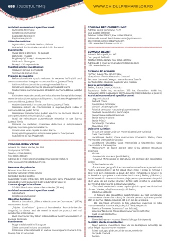 688 / JUDE%u021aUL TIMI%u0218 WWW.GHIDULPRIMARIILOR.ROActivitati economice si specifice zonei:Cultivarea terenuluiCre%u015fterea animalelorExploat%u0103ri forestiereExploatare piatr%u0103Obiective turistice:Agroturism, zon%u0103 de deal cu p%u0103dureMai exist%u0103 %u00eenc%u0103 ruinele castelului din SarazaniEvenimente:Ruga B%u00e2ra %u015fi Drinova - 15 augustBotine%u015fti - RusalePog%u0103ne%u015fti %u015fi Jure%u015fti - 8 septembrieS%u0103r%u0103zani - 29 augustBote%u015fti - 20 septembrieFacilit%u00e3%u0163i oferite investitorilor:Reduceri la taxe %u015fi impoziteTerenuri la pre%u0163uri miciProiecte de investi%u0163ii:Refunc%u021bionalizare spa%u021biu existent %u00een vederea %u00eenfiin%u021b%u0103rii unui centru comunitar integrat %u2013 comuna B%u00e2rna, jude%u021bul Timi%u0219Sal%u0103 multifunc%u021bional%u0103 la %u0219coala gimnazial%u0103 B%u00e2rnaConstruire spa%u021biu tehnic la %u0219coala gimnazial%u0103 B%u00e2rnaModernizare iluminat public stradal %u00een comuna B%u00e2rna, jude%u021bul Timi%u0219Extindere re%u021bea de canalizare %u00een localitatea%u00a0Bote%u0219ti %u0219i Botine%u0219ti, re%u021bea de aduc%u021biune ap%u0103 potabil%u0103 pentru localitatea Pog%u0103ne%u0219ti din comuna B%u00e2rna, jude%u021bul Timi%u0219Modernizare str%u0103zi %u00een comuna B%u00e2rna, jude%u021bul Timi%u0219Realizare sistem de monitorizare %u0219i supraveghere video %u00een comuna B%u00e2rna, jude%u021b Timi%u0219Realizarea transportului public electric %u00een comuna B%u00e2rna %u0219i zona periurban%u0103 a municipiului LugojSta%u021bii de re%u00eenc%u0103rcare autovehicule electrice %u00een uat B%u00e2rna, jude%u021bul Timi%u0219Dotarea cu mobilier, materiale didactice %u0219i echipamente digitale, la %u0219coala gimnazial%u0103B%u00e2rnaConstruirea unei capele %u00een satul B%u00e2rnaForaj ap%u0103 Pogane%u0219ti %u0219i echipament pentru func%u021bionareSubzidirea dc 123 Pog%u0103ne%u0219tiCOMUNA BEBA VECHEAdres%u0103: Str. Beba Veche, Nr. 292Cod po%u0219tal: 307035Telefon: 0256-385501; Fax: 0256-385501; Adresa de e-mail: secretariat@primariabebaveche.roURL: www.primariabebaveche.roPersoane din primarie:Primar: Ioan BohancanuSecretar general: Vete%u0219 IonelaContabil: Cordi%u0219 BeatrixSuprafa%u021ba:%u00a0 9405; Intravilan:%u00a0 189; Extravilan:%u00a0 9216; Popula%u021bia:%u00a0 1503; Gospod%u0103rii:%u00a0640; Locuin%u021be:%u00a0640; Gr%u0103dini%u021be:%u00a02; %u0218coli:%u00a03; Cum se ajunge in localitate:DJ 682 S%u00e2nnicolau Mare - Beba Veche (32 km)Activitati economice si specifice zonei:Agricultura Cre%u0219terea animalelorObiective turistice:Biserica Ortodox%u0103 %u201eSf%u00e2nta N%u0103sc%u0103toare de Dumnezeu%u201d (1779), monument istoric%u201eTriplex Confinium%u201d (punctul frontierelor Rom%u00e2nia-SerbiaUngaria), la c%u00e2teva zeci de metri la nord de punctul cel mai occidental al Rom%u00e2niei Bust memorial T%u00e9ry %u00d6d%u00f6n %u00eentemeiatorul turismului modern %u00een Europa Central%u0103Evenimente:Ruga tradi%u021bional%u0103 %u00een 15 augustZilele comunei %u00een luna octombrie %u00cent%u00e2lnirea interna%u021bional%u0103 %u00een cadrul Euroregiunii Dun%u0103re-Cri%u0219Mure%u0219-Tisa %u00een luna maiCOMUNA BECICHERECU MICAdres%u0103: Calea Banatului, nr. 9Cod po%u0219tal: 307040Telefon: 0256-378501; Fax: 0256-378805; Adresa de e-mail: becicherecumic@yahoo.comsecretar.becicherec@gmail.comURL: www.becicherecu-mic.roCOMUNA BELIN%u0162Adres%u0103: Principal%u0103, nr. 147Cod po%u0219tal: 307045Telefon: 0256-327126; Fax: 0256-327165; Adresa de e-mail: primariabelint@gmail.comURL: www.belint.roPersoane din primarie:Primar:%u00a0 Lauren%u021biu Ionel%u00a0T%u00eerziuViceprimar: Florin Alexandru%u00a0Grozoni%u00a0Secretar General Delegat: Ioana Roxana ZamfirContabilitate: consilier superior Vasi RodicaSate %u00een administra%u021bie:Belin%u0163, Babsa, Gruni, Chiz%u0103t%u0103uSuprafa%u021ba:%u00a0 5094 ha; Intravilan:%u00a0 373 ha; Extravilan:%u00a0 4098 ha; Popula%u021bia:%u00a03059; Gospod%u0103rii:%u00a01047; Locuin%u021be:%u00a01128; Gr%u0103dini%u021be:%u00a04; %u0218coli:%u00a03; Activitati economice si specifice zonei:Legumicultur%u0103Cultur%u0103 mareCre%u015fterea animalelorV%u00e2nz%u0103ri utilaje agricoleFabric%u0103 de sucuri naturale %u015fi ape mineraleProduse de mor%u0103rit %u015fi panifica%u0163iePrelucrarea material lemnosSta%u0163ie sortare balastSta%u0163ie PECOConstruc%u0163ii metaliceT%u00e2mpl%u0103rie PVCObiective turistice:%u00cen curs de construc%u0163ie un motel %u015fi pensiune turistic%u0103Case memoriale:Localitatea Belin%u0163: Casa memoriala Gherasim S%u00e2rbu,%u00a0 Casa memoriala Damaschin CarabaLocalitatea Chiz%u0103t%u0103u: Casa memoriala a Sepetenilor,%u00a0 Casa memoriala a R%u0103dule%u015ftilorMen%u0163ion%u0103m c%u0103%u00a0 toate aceste case %u015fi-au p%u0103strat structura original%u0103.Muzee :- Muzeul de Istorie al %u015ecolii Belin%u0163;- Muzeul Mineralogic al Banatului de c%u00e2mpie din localitatea Belin%u0163;Obiective Naturale:- %u00cencadrarea geografic%u0103%u00a0a comunei noastre face ca pe teritoriul nostru administrativ s%u0103%u00a0 fie dou%u0103%u00a0 r%u00e2uri mari ( Bega %u015fi Timi%u015ful ) care trec prin marginea a dou%u0103%u00a0 din sate ( Chiz%u0103t%u0103u %u015fi Gruni ) %u015fi %u00een imediata apropiere a celorlalte dou%u0103%u00a0 sate ( Belin%u0163%u00a0 %u015fi Babsa ). Astfel %u00een trei din sate s-au format plaje pentru petrecerea timpului liber vara, iar pe cursul r%u00e2urilor dintre sate relieful %u015fi vegeta%u0163ia permi%u0163%u00e2nd practicarea pescuitului sportiv.- Totodat%u0103 amintim la acest capitol %u015fi doi copaci vechi dat%u00e2nd din sec XIX-lea, afla%u0163i %u00een curtea %u015ecolii Belin%u0163Obiective istorice:- %u00cen fiecare din localit%u0103%u0163ile apar%u0163in%u0103toare au fost construite monumente ale eroilor c%u0103zu%u0163i la datorie pentru ap%u0103rarea patriei at%u00e2t %u00een primul r%u0103zboi mondial c%u00e2t
