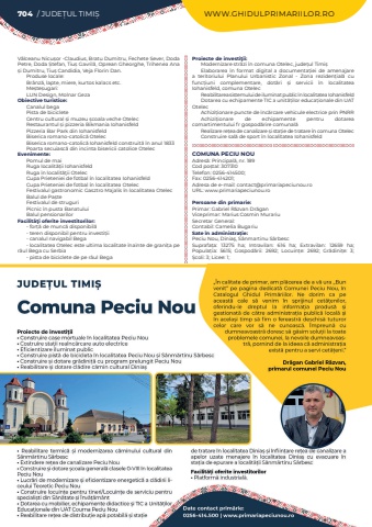704 / JUDE%u021aUL TIMI%u0218 WWW.GHIDULPRIMARIILOR.ROV%u00e2lceanu Nicu%u0219or -Claudius, Bratu Dumitru, Fechete Sever, Doda Petre, Doda %u0218tefan, Tiu%u0219 Gavril%u0103, Oprean Gheorghe, Trihenea Ana %u0219i Dumitru, Tiu%u0219 Candidia, Veja Florin Dan.Produse locale:Br%u00e2nz%u0103, lapte, miere, kurtos kalacs etc.Me%u0219te%u0219ugari: LUN Design, Molnar GezaObiective turistice:Canalul begaPista de bicicleteCentru cultural %u0219i muzeu %u0219coala veche OtelecRestaurantul %u0219i pizzeria Bikmania IohanisfeldPizzeria Bar Park din IohanisfeldBiserica romano-catolic%u0103 OtelecBiserica romano-catolic%u0103 Iohanisfeld construit%u0103 %u00een anul 1833 Poarta secuiasc%u0103 din incinta bisericii catolice OtelecEvenimente:Pomul de maiRuga localit%u0103%u021bii IohanisfeldRuga %u00een localit%u0103%u0163ii OtelecCupa Prieteniei de fotbal %u00een localitatea IohanisfeldCupa Prieteniei de fotbal %u00een localitatea OtelecFestivalul gastronomic Gasztro Majalis %u00een localitatea OtelecBalul de Pa%u0219teFestivalul de struguriPicnic %u00een pusta Banatului Balul pensionarilorFacilit%u00e3%u0163i oferite investitorilor:- for%u021b%u0103 de munc%u0103 disponibil%u0103- teren disponibil pentru investi%u021bii- canalul navigabil Bega- localitatea Otelec este ultima localitate %u00eenainte de grani%u021ba pe r%u00e2ul Bega cu Serbia- pista de biciclete de pe r%u00e2ul BegaProiecte de investi%u0163ii:Modernizare str%u0103zi %u00een comuna Otelec, jude%u021bul Timi%u0219Elaborarea %u00een format digital a documenta%u021biei de amenajare a teritoriului Planului Urbanistic Zonal - Zona reziden%u021bial%u0103%u00a0 cu func%u021biuni complementare, dot%u0103ri %u0219i servicii %u00een localitatea Iohanisfeld, comuna OtelecReabilitarea sistemului de iluminat public %u00een localitatea IohanisfeldDotarea cu echipamente TIC a unit%u0103%u021bilor educa%u021bionale din UAT OtelecAchizi%u021bionare puncte de %u00eenc%u0103rcare vehicule electrice prin PNRRAchizi%u021bionare de echipamente pentru dotarea comartimentului fr gospod%u0103rire comunal%u0103Realizare re%u021bea de canalizare %u0219i sta%u021bie de tratare %u00een comuna OtelecConstruire sal%u0103%u00a0de sport %u00een localitatea IohanisfeldCOMUNA PECIU NOUAdres%u0103: Principal%u0103, nr. 189Cod po%u0219tal: 307310Telefon: 0256-414500; Fax: 0256-414201; Adresa de e-mail: contact@primariapeciunou.roURL: www.primariapeciunou.roPersoane din primarie:Primar: Gabriel R%u0103zvan Dr%u0103ganViceprimar: Marius Cosmin MurariuSecretar General:%u00a0Contabil: Camelia BugariuSate %u00een administra%u021bie:Peciu Nou, Dinia%u015f, S%u00e2nmartinu S%u00e2rbescSuprafa%u021ba:%u00a0 13275 ha; Intravilan:%u00a0 616 ha; Extravilan:%u00a0 12659 ha; Popula%u021bia:%u00a0 5615; Gospod%u0103rii:%u00a0 2692; Locuin%u021be:%u00a0 2692; Gr%u0103dini%u021be:%u00a0 3; %u0218coli:%u00a03; Licee:%u00a01;