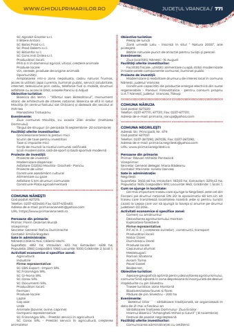 WWW.GHIDULPRIMARIILOR.RO JUDE%u021aUL VRANCEA / 771SC Agrobit Ecostar s.r.l.II Bitere AntoniSC Balas Prod s.r.l.SC Prod Dalemi s.r.l.SC Bitionfor s.r.l.SC Cons Inst Drilea s.r.l.Produc%u0103tori locali:PFA %u0219i II %u00een domeniul agricol, viticol, cre%u0219tere animale Produse locale:Vin, cereale, produse de origine animal%u0103 Oportunit%u0103%u021bi:Amplasarea intr-o zona nepoluata, cadru natural frumos, acces la utilitati (apa curenta, iluminat public, servicii salubritate, internet, televiziune prin cablu, telefonie fix%u0103%u00a0%u0219i mobil%u0103, drumuri asfaltate cu acces la DN2, ora%u0219ele Panciu %u0219i AdjudObiective turistice:Biserica din lemn - %u201cSf%u00e2ntul Ioan Botez%u0103torul%u201d, monument istoric de arhitectur%u0103 de interes na%u021bional. Biserica se afl%u0103 %u00een satul Movili%u021ba (%u00een centrul fostului sat Chi%u021bcani) %u0219i dateaz%u0103 din secolul al XVII-lea Manastirea Trotu%u0219anuEvenimente:Ziua comunei Movili%u021ba, cu ocazia Zilei eroilor (Inaltarea Domnului) T%u00e2rgul de struguri (in perioada 15 septembrie- 20 octombrie)Facilit%u00e3%u0163i oferite investitorilor:Concesionare teren la pre%u021buri miciScutiri de taxe pentru investitoriTaxe %u0219i impozite miciFor%u021b%u0103 de munc%u0103 la nivelul comunei calificat%u0103%u0218coli modernizate, sal%u0103 de sport %u0219i baz%u0103 sportiv%u0103 modern%u0103Proiecte de investi%u0163ii:Proiecte de investi%u021biiModernizare dispensarAsfaltare DJ205J Movilita- Diocheti- PanciuProiecte de viitorConstruire a%u0219ez%u0103m%u00e2nt culturalAlimentare cu gazeAsfaltare 5 km drumuri comunale Construire Pia%u021ba agroalimentar%u0103COMUNA N%u0102NE%u015eTICod po%u0219tal: 627215Telefon: 0237-633400; Fax: 0237-633483; Adresa de e-mail: primariananesti@yahoo.comURL: https://www.primariananesti.roPersoane din primarie:Primar: Florin Cezarian Buc%u0219%u0103Viceprimar:%u00a0Secretar General: Rafira%u00a0Dumitrache%u00a0Contabil:%u00a0Emilia%u00a0Bogdan%u00a0Sate %u00een administra%u021bie:N%u0103ne%u0219ti,C%u0103lienii-Noi, C%u0103lienii-VechiSuprafa%u021ba:%u00a0 4951 ha; Intravilan:%u00a0 433 ha; Extravilan:%u00a0 4518 ha; Popula%u021bia:%u00a02360; Gospod%u0103rii:%u00a01060; Locuin%u021be:%u00a01000; Gr%u0103dini%u021be:%u00a02; %u0218coli:%u00a01; Activitati economice si specifice zonei:Agricultur%u0103IndustrieFirme reprezentative:SC CBS Export %u2013Import SRLSC FrizonAgra SRLSC Gi-Nona SRLSC Corox SRLSC Documenti SRLProduc%u0103tori locali:FermieriProduse locale:LapteCa%u015f oaieUrd%u0103Animale (bovine, ovine, caprine)Companii reprezentative:SC FrizonAgra SRL - Prest%u0103ri servicii %u00een agricultur%u0103SC Corox SRL - Prest%u0103ri servicii %u00een agricultur%u0103, cre%u015fterea animalelorObiective turistice:Peisaj de lunc%u0103Zon%u0103%u00a0 umed%u0103%u00a0 Lalu - %u00eenscris%u0103 %u00een situl %u201c Natura 2000%u201d, arie protejat%u0103B%u0103l%u021bile naturale punct de atrac%u021bie pentru turi%u015fti %u015fi pescariEvenimente:Ziua localit%u0103%u021bii N%u0103ne%u0219ti -16 AugustFacilit%u00e3%u0163i oferite investitorilor:Facilit%u0103%u021bi fiscale , utilit%u0103%u021bi: alimentare cu ap%u0103, str%u0103zi modernizate %u00een toate satele componente comunei, iluminat publicProiecte de investi%u0163ii:Modernizare %u0219i reabilitare drumuru de interes local %u00een comuna N%u0103ne%u0219ti, jude%u021bul VranceaConstruire capacit%u0103%u021bi de produc%u021bie energie electric%u0103%u00a0din surse regenerabile - Panouri Fotovoltalice - pentru consum propriu U.A.T N%u0103ne%u0219ti, jude%u021bul%u00a0%u00a0Vrancea, 75kwpCOMUNA N%u0102RUJACod po%u0219tal: 627220Telefon: 0237-677111, 677311; Fax: 0237-677311; Adresa de e-mail: primaria_naruja@yahoo.comCOMUNA NEGRILE%u015eTIAdres%u0103: Str. Principal%u0103, Nr. 479Cod po%u0219tal: 627021Telefon: 0237-267290, 267035; Fax: 0237-267290; Adresa de e-mail: primaria.negrilesti@yahoo.comURL: www.primarianegrilesti.roPersoane din primarie:Primar: R%u0103zvan Mih%u0103i%u021b%u0103 Pantazic%u0103Viceprimar:%u00a0Secretar General delegat: Maria B%u0103deanuContabil: Marinela- Ionela OanceaSate %u00een administra%u021bie:Negrile%u015ftiSuprafa%u021ba:%u00a03402,46 ha; Intravilan:%u00a0183,03 ha; Extravilan:%u00a03219,43 ha; Popula%u021bia:%u00a01635; Gospod%u0103rii:%u00a0810; Locuin%u021be:%u00a0840; Gr%u0103dini%u021be:%u00a01; %u0218coli:%u00a01; Cum se ajunge in localitate:Cel mai important traseu care ajunge la Negrile%u0219ti ,este cel din Foc%u0219ani pe drumul na%u021bional DN 2D la aproximativ 60 km.Un alt traseu care tranziteaz%u0103 localitatea noastr%u0103 ,este %u0219i pentru turi%u0219tii caza%u021bi la Lep%u0219a care vor s%u0103 ajung%u0103 la Soveja %u0219i anume pe drumul jude%u021bean DJ 205L.Activitati economice si specifice zonei:Comer%u0163 cu am%u0103nuntulDezvoltarea agroturismului montanExploatare forestier%u0103Firme reprezentative:P.F.A/ A .F. ( cre%u0219terea ovinelor) , construc%u021bii, transportProduc%u0103tori locali:Nistor DorelDumitra%u0219cu DorelProduse locale:Ca%u0219cavalul afumatMe%u0219te%u0219ugari:Roman StratonaAvram TomaPavel Costel Bodea IonObiective turistice:A%u015fezare geografic%u0103 optim%u0103 pentru dezvoltarea agroturismului, comuna fiind a%u015fezat%u0103 %u00een zona depresionar%u0103 %u00eenconjurat%u0103 de dealuri %u00eemp%u0103durite cu pin SilvestruTrasee turistice, zona Montan%u0103Biodiversitatea faunei %u0219i floreiP%u0103dure de pin Silvestru %u2013 200 haEvenimente:`Boteitul Oilor`` - s%u0103rb%u0103toare tradi%u0163ional%u0103, se organizeaz%u0103 %u00een data de 21 mai a fiec%u0103rui anS%u0103rb%u0103toarea %u00cenal%u021barea Domnului- Ziua EroilorHramul Bisericii %u201cArhangheli Mihail %u0219i Gavril%u201d ( 8 noiembrie)Festival de poezie negrile%u015ftean%u0103Facilit%u00e3%u0163i oferite investitorilor:Comunicarea administra%u021biei cu cet%u0103%u021benii