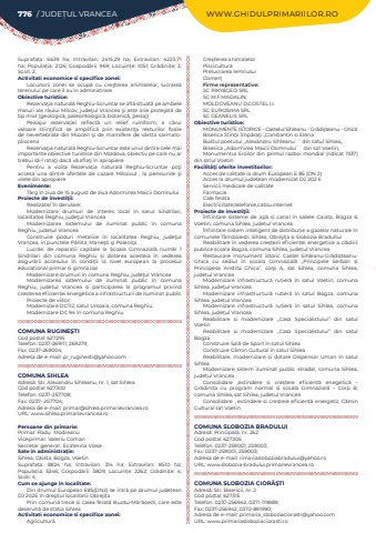 Suprafa%u021ba:%u00a0 6639 ha; Intravilan:%u00a0 2415,29 ha; Extravilan:%u00a0 4223,71 ha; Popula%u021bia:%u00a02126; Gospod%u0103rii:%u00a0969; Locuin%u021be:%u00a01051; Gr%u0103dini%u021be:%u00a03; %u0218coli:%u00a02; Activitati economice si specifice zonei:Locuitorii zonei se ocup%u0103 cu cre%u015fterea animalelor, lucrarea terenului pe care %u00eel au %u00een administrareObiective turistice:Rezerva%u0163ia natural%u0103 Reghiu-Scruntar se afl%u0103 situat%u0103 pe ambele maluri ale r%u00e2ului Milcov, jude%u0163ul Vrancea %u015fi este arie protejat%u0103 de tip mixt (geologic%u0103, paleontologic%u0103, botanic%u0103, peisaj)Peisajul rezerva%u0163iei reflect%u0103 un relief ruiniform, a c%u0103rui valoare stiin%u0163ific%u0103 se amplific%u0103 prin existen%u0163a resturilor fosile de nevertebrate din Miocen %u015fi de mamifere de v%u00e2rsta sarmatopliocenaRezerva%u0163ia natural%u0103 Reghiu-Scruntar%u00a0este unul dintre cele mai importante obiective turistice din%u00a0Moldova, obiectiv pe care nu ar trebui s%u0103-l rata%u0163i dac%u0103 v%u0103 afla%u0163i %u00een apropierePentru a vizita%u00a0 Rezerva%u0163ia natural%u0103 Reghiu-Scruntar%u00a0 po%u0163i accesa una dintre ofertele de%u00a0 cazare Milcovul%u00a0 , la pensiunile %u015fi vilele din apropiereEvenimente:T%u00e2rg %u00een ziua de 15 august de ziua Adormirea Maicii DomnuluiProiecte de investi%u0163ii:Realizate/ %u00cen derulare:Modernizare drumuri de interes local %u00een satul Sindrilari, localitatea Reghiu, jude%u0163ul VranceaModernizarea sistemului de iluminat public %u00een comuna Reghiu, jude%u021bul VranceaConstruire poduri metalice %u00een localitatea Reghiu, jude%u0163ul Vrancea, %u00een punctele P%u00e2rlita, Mane%u015fti %u015fi Poieni%u0163aLucr%u0103ri de repara%u021bii capitale la %u0218coala Gimnazial%u0103 num%u0103r 1 %u0218indrilari din comuna Reghiu %u0219i dotarea acesteia %u00een vederea asigur%u0103rii accesului %u00een condi%u021bii la nivel european la procesul educa%u021bional primar %u0219i gimnazial Modernizare drumuri %u00een comuna Reghiu, jude%u0163ul VranceaModernizarea sistemului de iluminat public %u00een comuna Reghiu, jude%u021bul Vrancea %u0219i participarea la programul privind cre%u0219terea eficien%u021bei energetice a infrastructurii de iluminat publicProiecte de viitor:Modernizare DC112, satul Ursoaia, comuna ReghiuModernizare DC 94 %u00een comuna Reghiu COMUNA RUGINE%u015eTICod po%u0219tal: 627295Telefon: 0237-269111, 269279; Fax: 0237-269004; Adresa de e-mail: pr_ruginesti@yahoo.comCOMUNA SIHLEAAdres%u0103: Str. Alexandru Sihleanu, nr. 1, sat SihleaCod po%u0219tal: 627300Telefon: 0237-257708; Fax: 0237- 257704; Adresa de e-mail: primar@sihlea.primarievrancea.roURL: www.sihlea.primarievrancea.roPersoane din primarie:Primar:%u00a0Radu%u00a0%u00a0Modreanu%u00a0Viceprimar: Valeriu%u00a0Coman%u00a0Secretar general:%u00a0 Ecaterina%u00a0Vlase%u00a0%u00a0Sate %u00een administra%u021bie:Sihlea, C%u0103iata, Bogza, VoetinSuprafa%u021ba:%u00a0 8824 ha; Intravilan:%u00a0 314 ha; Extravilan:%u00a0 8510 ha; Popula%u021bia:%u00a0 5246; Gospod%u0103rii:%u00a0 3809; Locuin%u021be:%u00a0 2262; Gr%u0103dini%u021be:%u00a0 4; %u0218coli:%u00a04; Cum se ajunge in localitate:Din drumul European E85(DN2) se intr%u0103%u00a0pe drumul jude%u021bean DJ 202E %u00een dreptul localitatii ObrejitaPrin comun%u0103%u00a0trece %u0219i calea ferat%u0103%u00a0Buz%u0103u-M%u0103r%u0103%u0219esti, care este deservit%u0103%u00a0de sta%u021bia SihleaActivitati economice si specifice zonei:Agricultur%u0103Cre%u015fterea animalelorPiscicultur%u0103 Prelucrarea lemnuluiComer%u0163Firme reprezentative:SC RIKY&GEO SRLSC M.F.MADALINMOLDOVEANU D.COSTEL I.I.SC EUROSIMA SRLSC GEANELIS SRLObiective turistice:MONUMENTE ISTORICE - Castelul Sihleanu - Gr%u0103di%u015fteanu - Ghic%u0103Biserica Sfin%u0163ii %u00cemp%u0103ra%u0163i ,,Constantin si Elena``Bustul poetului ,,Alexandru Sihleanu`` din satul Sihlea,,Biserica ,,Adormirea Maicii Domnului`` din sat Voetin, Monumentul Eroilor din primul razboi mondial (ridicat 1937) din satul VoetinFacilit%u00e3%u0163i oferite investitorilor:Acces de calitate la drum European E 85 (DN 2)Acces la drumul jude%u021bean modernizat DJ 202 EServicii medicale de calitateFarmacieCale ferataElectricitate,telefonie,cablu,internetProiecte de investi%u0163ii:%u00cenfiin%u021bare sisteme de ap%u0103%u00a0 %u0219i canal %u00een satele Caiata, Bogza %u0219i Voetin, comuna Sihlea, jude%u021bul%u00a0Vrancea%u00cenfiin%u021bare sistem inteligent de distribu%u021bie a gazelor naturale %u00een comunele T%u00e2mboie%u0219ti, Sihlea, Obreji%u021ba %u0219i Slobozia BradulluiReabilitare %u00een vederea cre%u0219terii eficien%u021bei energetice a cl%u0103dirii publice %u0219coala Bogza, comuna Sihlea, jude%u021bul VranceaRestaurare monument istoric Castel Sihleanu-Gr%u0103di%u0219teanuGhica cu sediul %u00een %u0219coala Gimnazial%u0103%u00a0 ,,Principele %u0218erban %u0219i Principesa Aristita Ghica%u201d, corp A, sat Sihlea, comuna Sihlea, jude%u021bul%u00a0VranceaModernizare infrastructur%u0103%u00a0 rutier%u0103%u00a0 %u00een satul Voetin, comuna Sihlea, jude%u021bul%u00a0VranceaModernizare infrastructur%u0103%u00a0 rutier%u0103%u00a0 %u00een satul Bogza, comuna Sihlea, jude%u021bul VranceaModernizare infrastructur%u0103%u00a0 rutier%u0103%u00a0 %u00een satul Sihlea, comuna Sihlea, jude%u021bul VranceaReabilitare %u0219i modernizare ,,Casa Specialistului%u201d din satul VoetinReabilitare %u0219i modernizare ,,Casa Specialistului%u201d din satul BogzaConstruire Sal%u0103%u00a0de Sport %u00een satul SihleaConstruire C%u0103min Cultural %u00een satul SihleaReabilitare, modernizare %u0219i dotare Dispensar Uman %u00een satul SihleaModernizare sistem iluminat public stradal, comuna Sihlea, jude%u021bul VranceaConsolidare ,extindere %u0219i cre%u0219tere eficient%u0103%u00a0 enegetic%u0103%u00a0 %u2013 Gr%u0103dini%u021ba cu program normal %u0219i %u0219coala Gimnazial%u0103%u00a0 %u2013 Corp B, comuna Sihlea, sat 